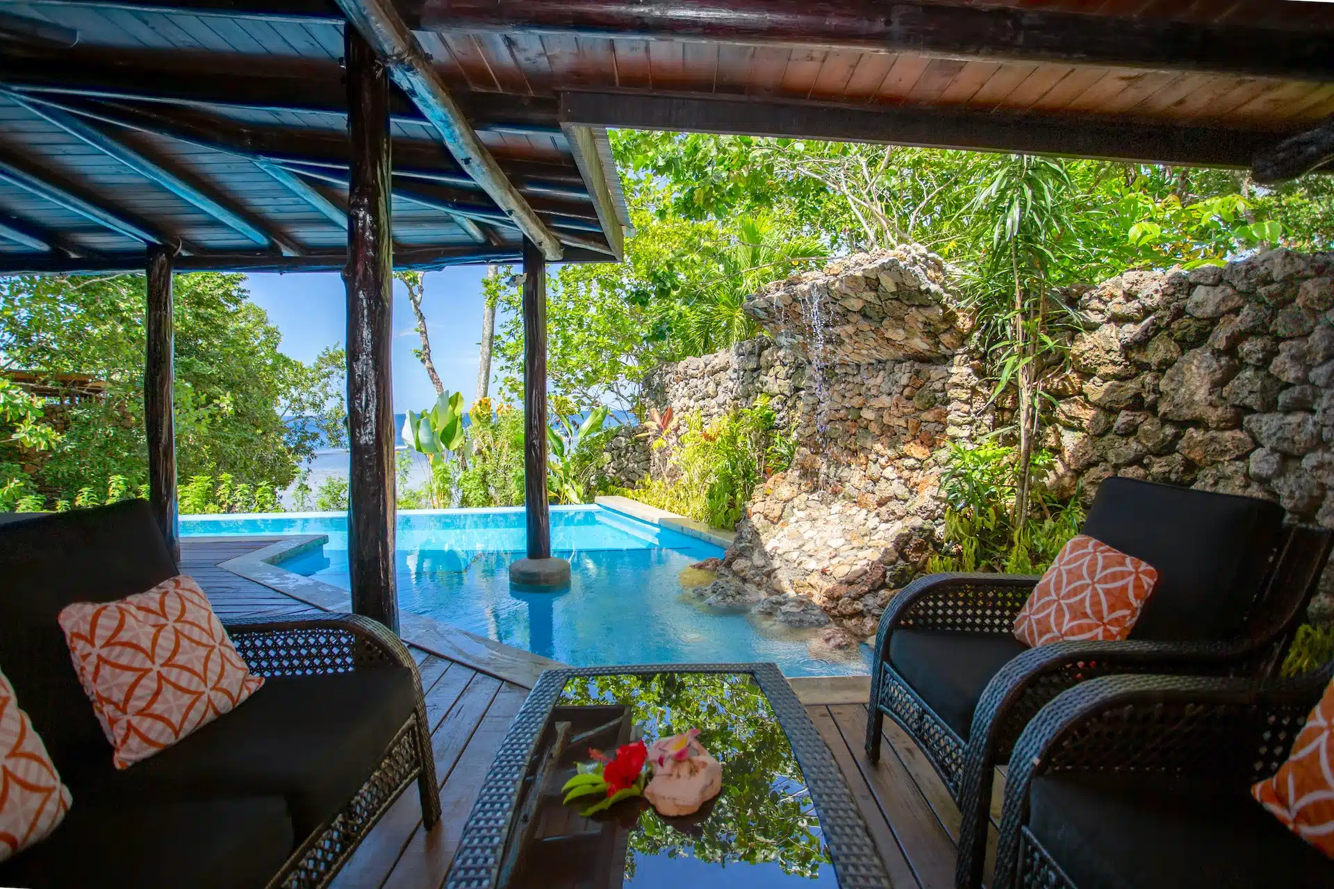 Clifftop Villa Five is what holiday fantasies are made of – this two bedroom villa is perched atop a rocky outcrop with sublime sea views, boasting a private bridge entry over a natural volcanic crevasse, and a generous floor plan over 1,100 sq. ft. You’ll feel like you’ve stepped into a treetop jungle dream, your own private hideaway amidst the blue and green hues of a postcard-perfect tropical island.